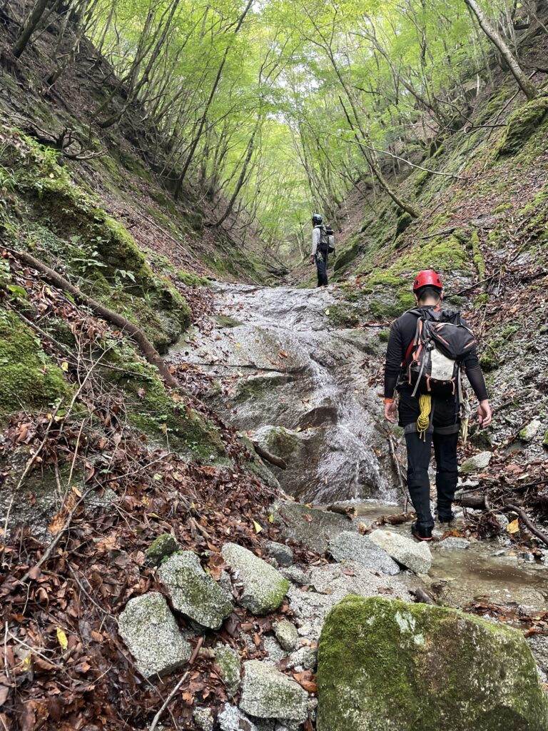 その後は、いくつかの緩やかな滝を越えていきました。あたりはだんだんと苔むしたゴーロ地帯に変わっていきました。ただ、しばらくすると景色があまり変わらない感じになってきたので、900m地点の二股を善六ノタワ方向へ進み、ここで遡行を切り上げることにしました。
