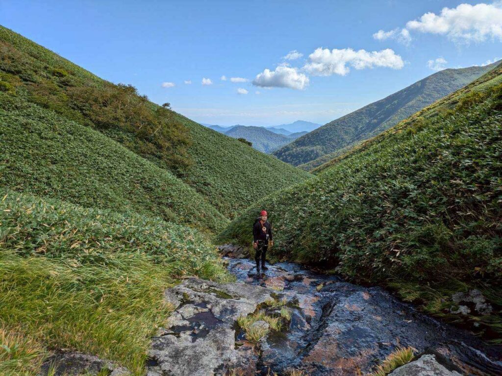 ナルミズ沢は広いゴーロを歩き、源頭部までずっと続くナメ滝の連続、そしてゴルジュや魚止めの滝など、ちょっとした登攀的な要素も楽しめて大満足でした。