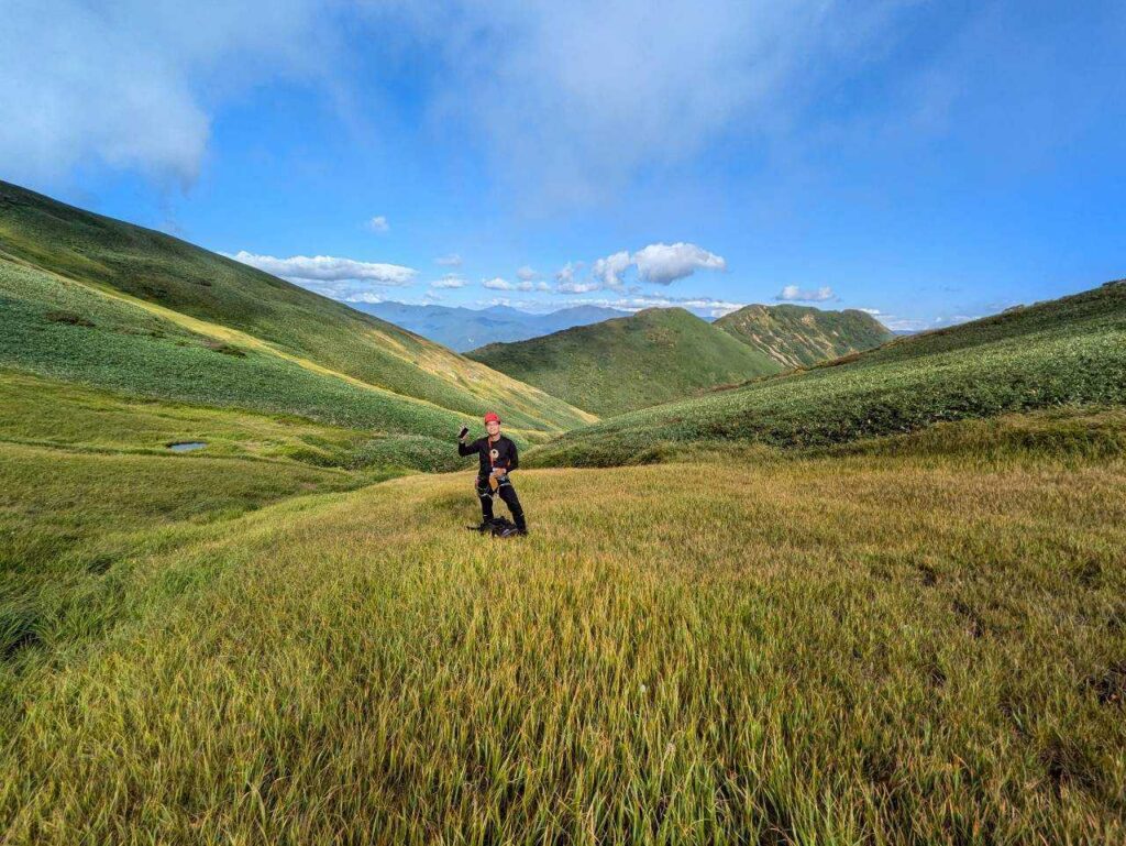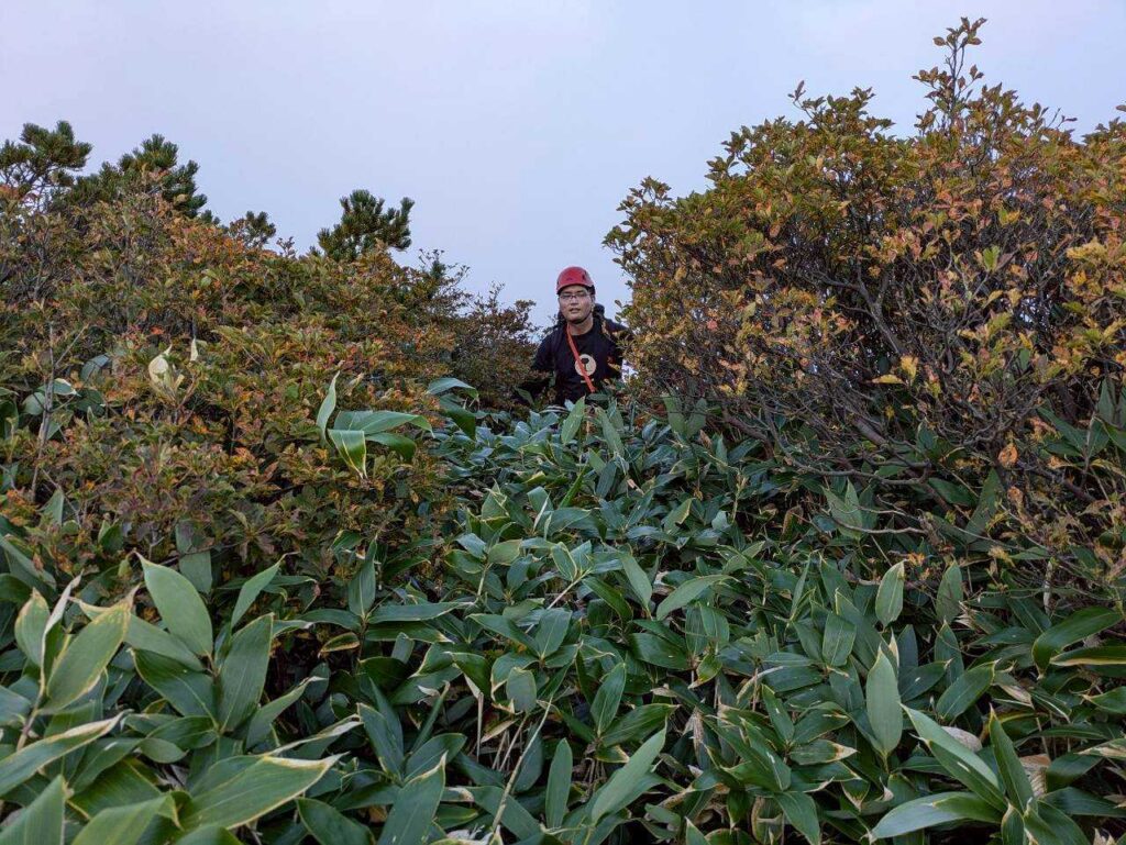 ここからは朝日岳へと向かう稜線歩きです。低い笹がずっと生えていて、その下にうっすらと登山道が埋もれている状態でした。沢で結構体力を使っていたのもあり、この笹こぎがボディブローのように効いてきました。