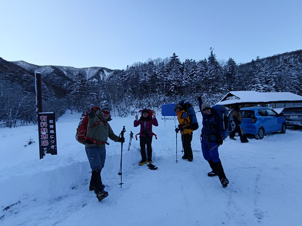 出発!快晴の穏やかな天気で、多くの登山者と、その帰りを待つ路駐で賑わっていました。
