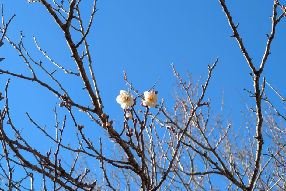 長い年末年始のお休み、トマの面々は思い思いに冬山を堪能しましたが、ここはポカポカの陽気で梅が咲き始めていました。
