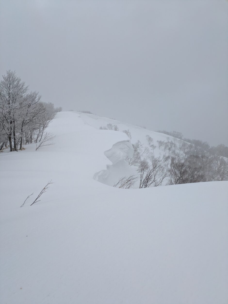 三岩山からは広く気持ちのいい斜面となる。晴れていたらもっと気持ちよかっただろう。阿能川岳の山頂にほどなく到着。しかし気温は低めでじっとしていると冷えてくるので、早々に下り始めた。細い尾根をアイゼンで慎重に通過、しかしやはり下りでトレースが付いていると早く、明るいうちにテントにたどり着くことができた。下りの途中で晴れ間も見えて小出俣山がガスの中から姿を現し、次はここにおいでよと誘っているようだった。