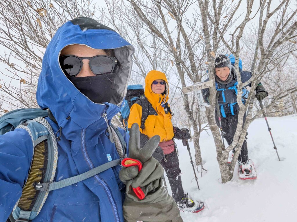2/7 仏岩峠パーキングから、吾妻耶山へのトレースをしばらくたどり、適当なところから阿能川岳への尾根に乗る。稜線に出ると、阿能川岳に続く古いトレースがあった。道らしくなっているので、どうやら夏道ができているようだ。しばらくたどると、薄かったトレースは消えるが、スノーシューだとさほど潜らない。初スノーシューのS藤Yも、初めてとは思えないくらい元気に進んでいく。みなでラッセルを交代しながら、順調に高度を上げ、天子山に到着した。さて、ここで荷物を降ろして作戦会議。当初予定だと三岩山に幕予定だったが、今晩から明朝にかけて予報は雪。幸い、予定よりも早く進めているので、ここからなら阿能川岳を今日中にピストンできるだろう、ということで、天子山付近で幕を張ることにした。これは正解で、ここから尾根が細くなり、岩を巻いたり足場の悪いところを通過したりという場面で荷物が軽くて助かった。しばらくはスノーシューで粘ったが、結局アイゼンに変更、細い尾根を過ぎたところで再びスノーシューに履き替えた。
