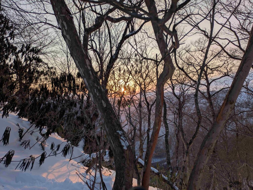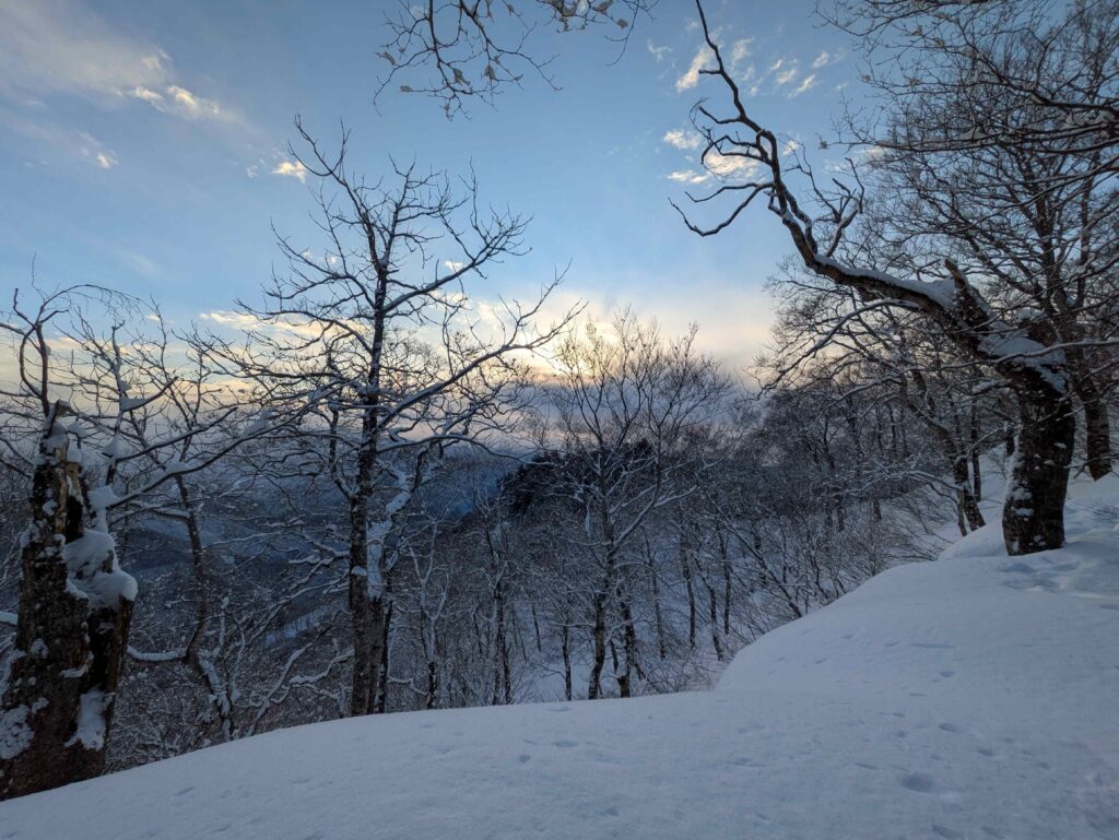 当初金城山ラッセル山行予定だったが、大雪の天気予報にて車ラッセルになりそうだったので敢え無く転進、トンネルを越えるのをやめてF永提案の阿能川岳に行くことにした。結果的に大正解で、ガスの中浮かび上がる小出俣山や夕日・青空などを見ることができた。