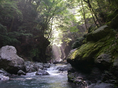 8/5 なるべく取水堰の近くから入渓しようと、工事で車止めになっている所まで栗代林道を車で入る。そこから栗代川に下りようとしたら、下りの尾根が意外に悪く、入渓までに1時間近くかかってしまった。そこから遡行開始、1時間ほど歩くと取水堰が現れる。ここからは所々へつりや軽い泳ぎも交えて通過する。八丁暗見はよく分からないうちに通過、どうやら水が少なめのようだ。
