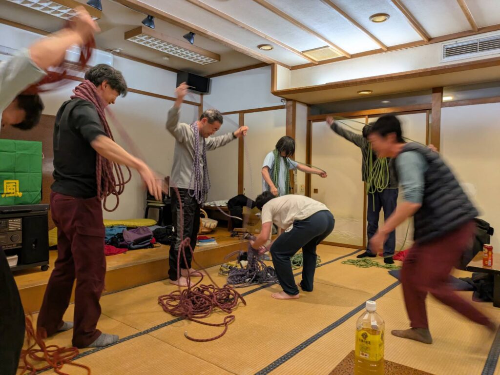 前夜祭では、速さと美しさを競うロープ束ね競走が大白熱!ギアや山道具、書籍のオークション大会も行われました